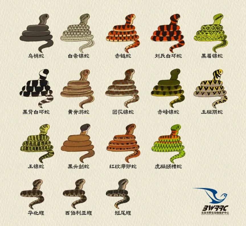 虽然大多数人并没在野外遇见过蛇, 似乎让人误以为北京的蛇类资源并不丰富,但实际上,北京的蛇类多样性在北方地区是很高的,有很多主要分布在南方的蛇,最北的分布线都是北京。北京地区目前发现有17种蛇,其中13种是不会致人严重伤害,可以称之为无毒蛇的蛇类(白条锦蛇、赤峰锦蛇、王锦蛇、团花锦蛇、黑眉锦蛇、玉斑丽蛇、红纹滞卵蛇、赤链蛇、黑背白环蛇、刘氏白环蛇、黑头剑蛇、黄脊游蛇、乌梢蛇),有3种是管牙蛇的毒蛇(短尾蝮、华北蝮、西伯利亚蝮),1种具有发达的达氏腺可以引发强烈出血的毒蛇(虎斑颈槽蛇)。